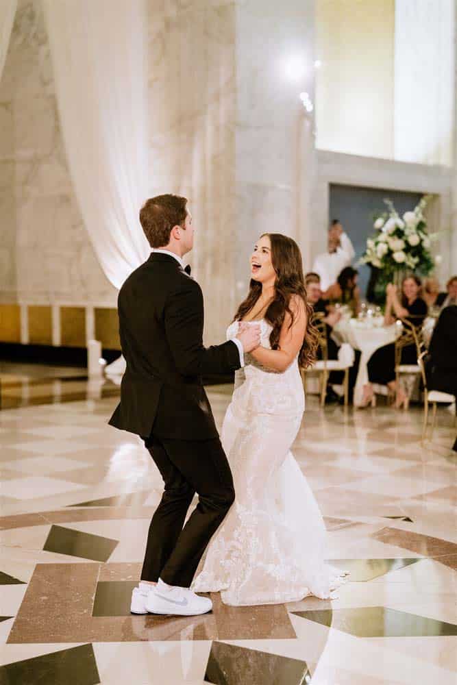Planning: Cavalier Company & Alexis Wells-Loneman | Venue: The Post 433 | Catering: Jewell Events Catering | Photography: Karlie Dru | Linens: Windy City Linen | Florals: Life in Bloom | Lighting & Drapery: Elegant Event Lighting | Chairs, Chargers, and Wedding Stage: Tablescape Event Rentals | Rentals: Bowery and Bash | Entertainment: The DJ Firm | Hair and Makeup: Bianca Sansosti Artistry | Photo Booth: MK Event Photo | Phone Message Guest Book: Photique | Celebrant: Acorn to Oak Ceremonies | Transportation: Celeblux Limos | Hotels: The LaSalle Chicago and Residence Inn Chicago Loop | Bridal Gown Designer: Martina Liana Bridal | Bride’s Shoes: Jimmy Choo and Nike | Groom’s Attire: Armani | Groom’s Shoes: Magnanni | Groom’s Watch: Rolex | Engagement Ring: Glitters Fine Jewelery | Wedding Bands: Tivol | Invitations: Minted | Bride and Groom: Cailey and Matt Schell