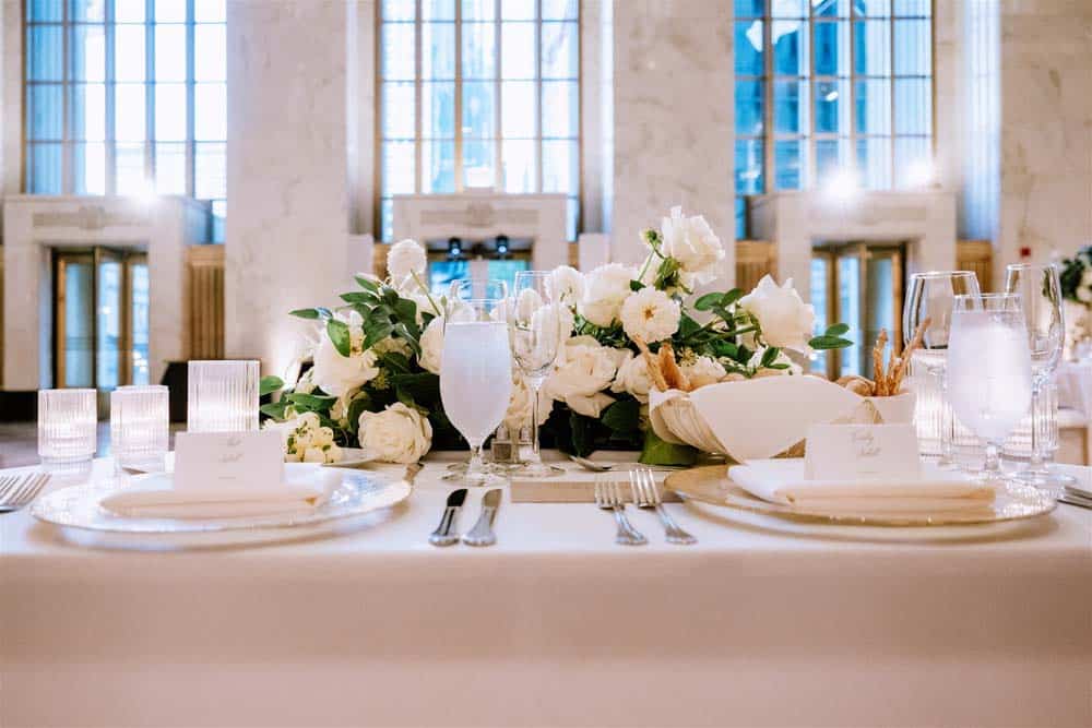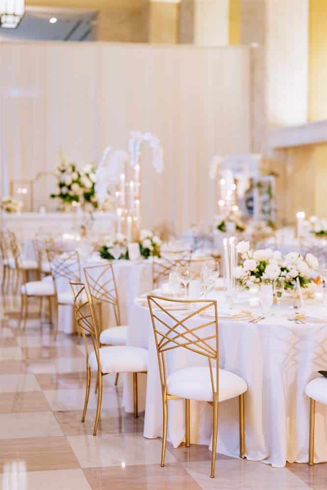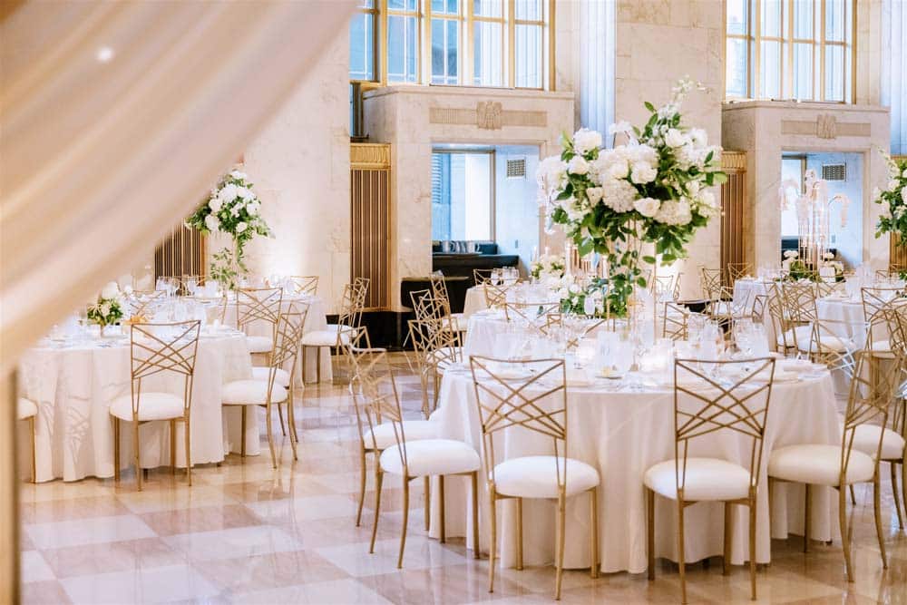 The Old Post Office is a Chicago treasure, and Tablescapes’ rentals made the space iconic and beautiful. The wedding stage decoration of the wedding during marriage provided an ideal sight for guests to witness the ceremony, and the raised seating design created an intimate day despite the size of the room. At the reception, gold wedding chairs and gold plate chargers dressed the tables to greet guests as they sat down, and it established the tone for a night with memories.