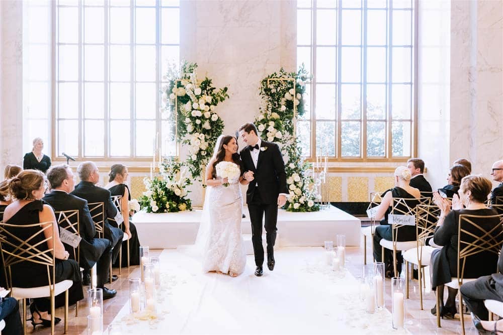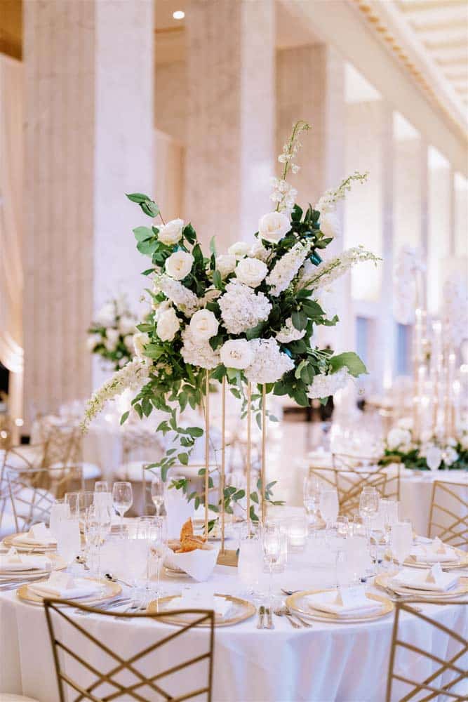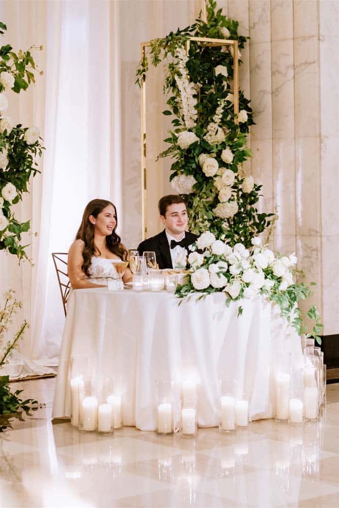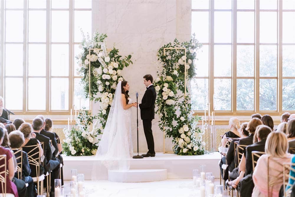 The stage for the wedding was centered in the ceremony area, with a stunning wedding stage draped in gorgeous florals in whites and bright greenery. Tablescapes adorned the sleek, raised stage platform so Cailey and Matt were the center of attention in the room when they exchanged vows under towering windows and golden accents. This beautifully designed marriage wedding stage decoration not only provided a beautiful and functional ambiance, but also perfectly complemented the grandeur of the setting. The combination of floral installations and the modern stage design provided an exquisite hint of contrast of romance and architectural drama.