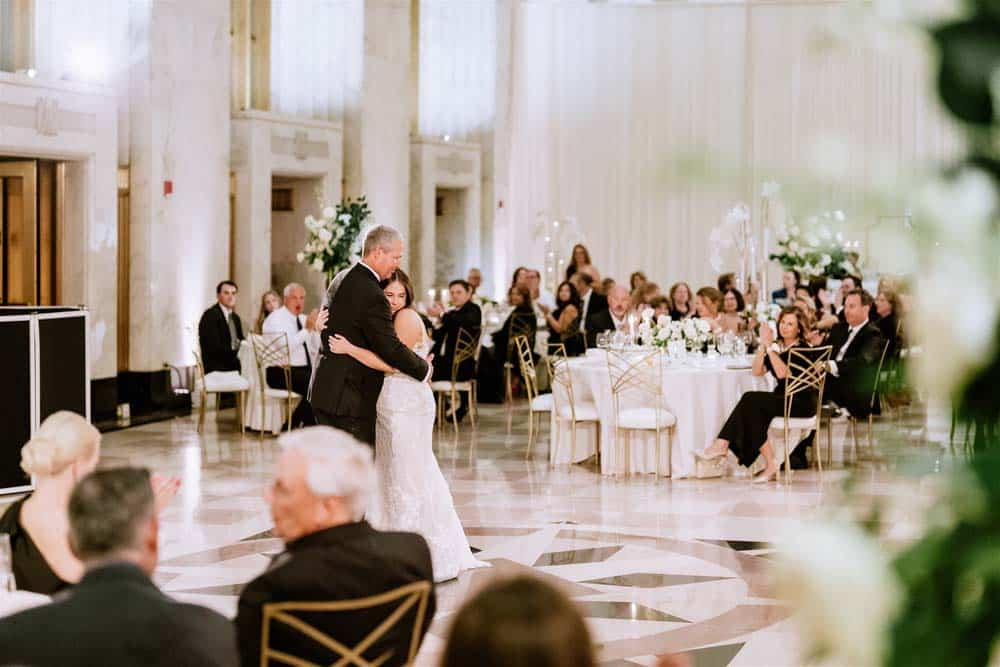 Cailey and Matt’s wedding at the Old Post Office in Chicago felt both grand and contemporary, with the venue’s history framing a sleek celebration. With its soaring ceilings, marble columns, and gilded accents, this landmark venue set the stage for a celebration that was both timeless and enchanting. Enhancing the beauty of this space was a thoughtfully designed wedding stage and ceremony and reception setting, brought to life with rentals from Tablescapes Event Rentals.