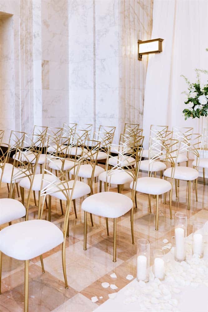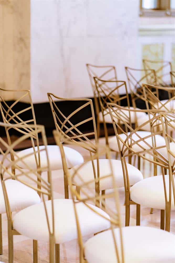 As warm as the gold wedding chairs, a famous find for their chameleon nature that perfectly complements any theme. Their geometric backs added a modern touch to the reception and complemented the art deco accents of the Old Post Office building itself. Together, the gold chargers and gold wedding chairs created a unified look that tied the whole affair together.